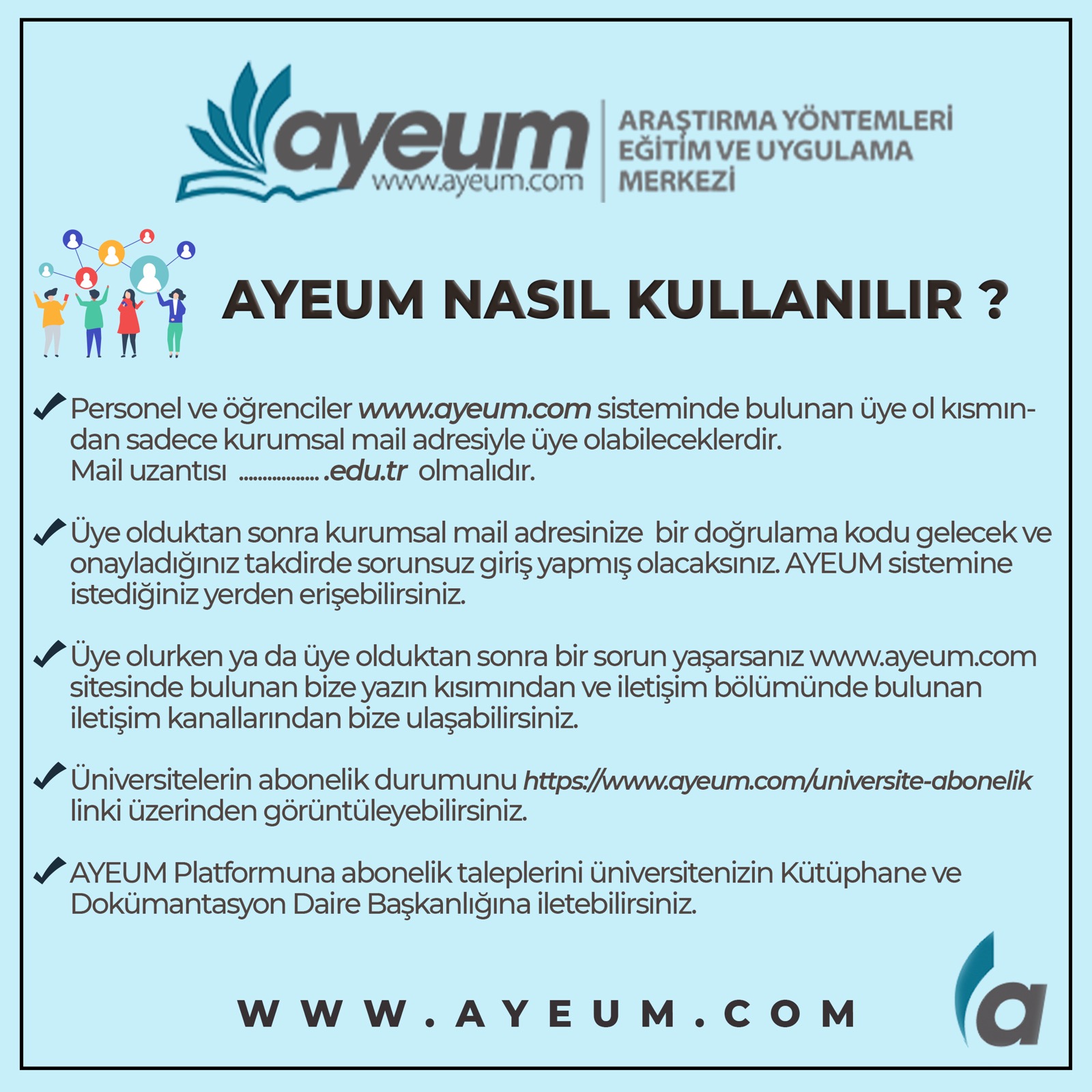 Ayeum veri tabanı 26.09.2023 tarihine kadar deneme erişimine açılmıştır. Veri tabanına edu.tr uzantılı mail adresiniz ile kayıt yapılması yeterli olacaktır.