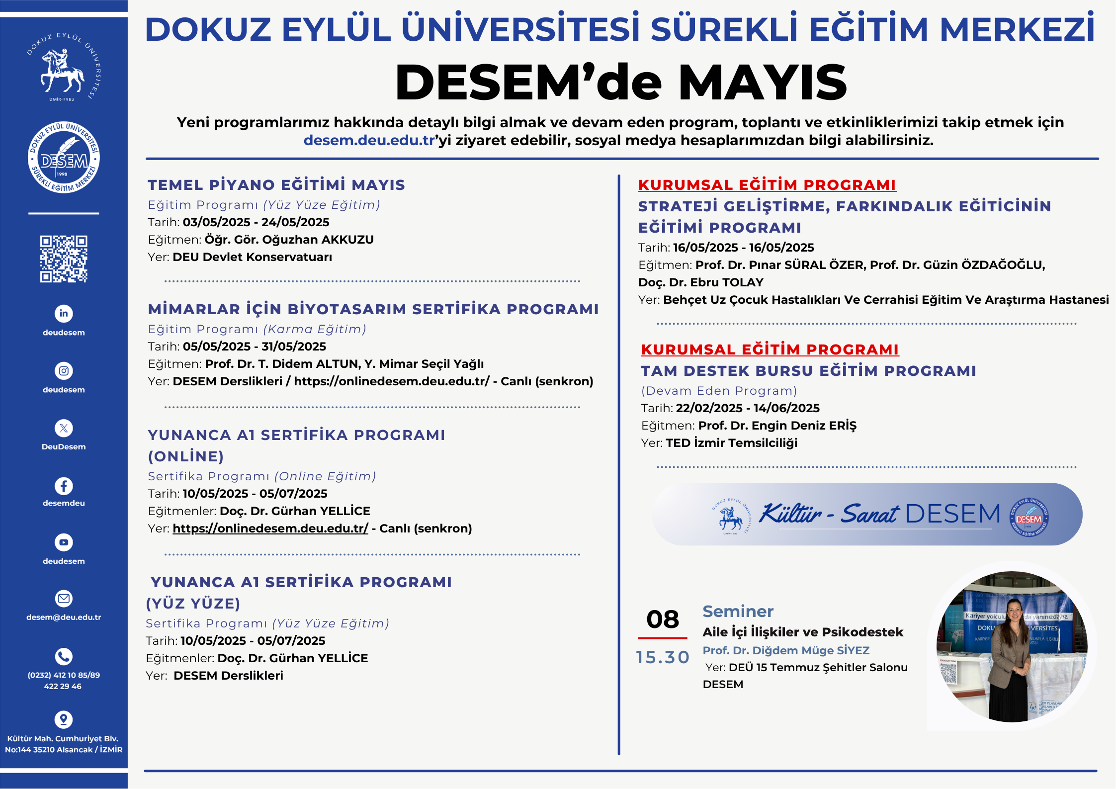 DOKUZ EYLÜL ÜNİVERSİTESİ REKTÖRLÜĞÜ-Dokuz Eylül Üniversitesi Sürekli Eğitim Merkezi 2025 Yılı Mayıs Ayı Eğitim Programı