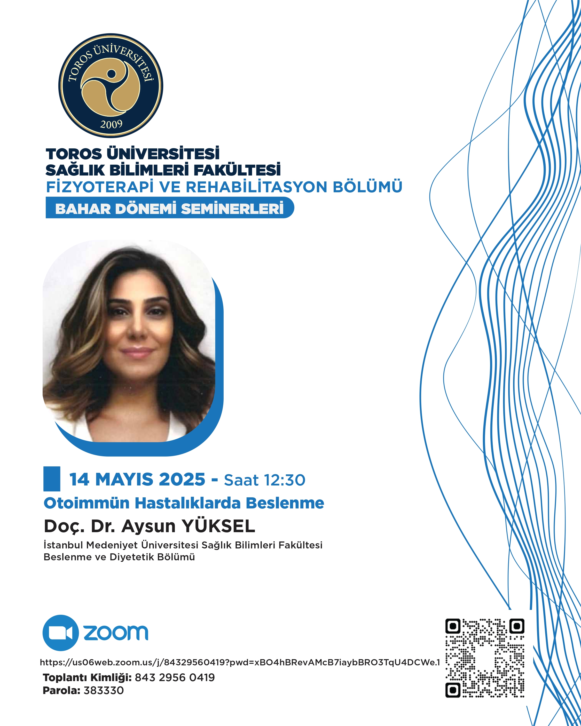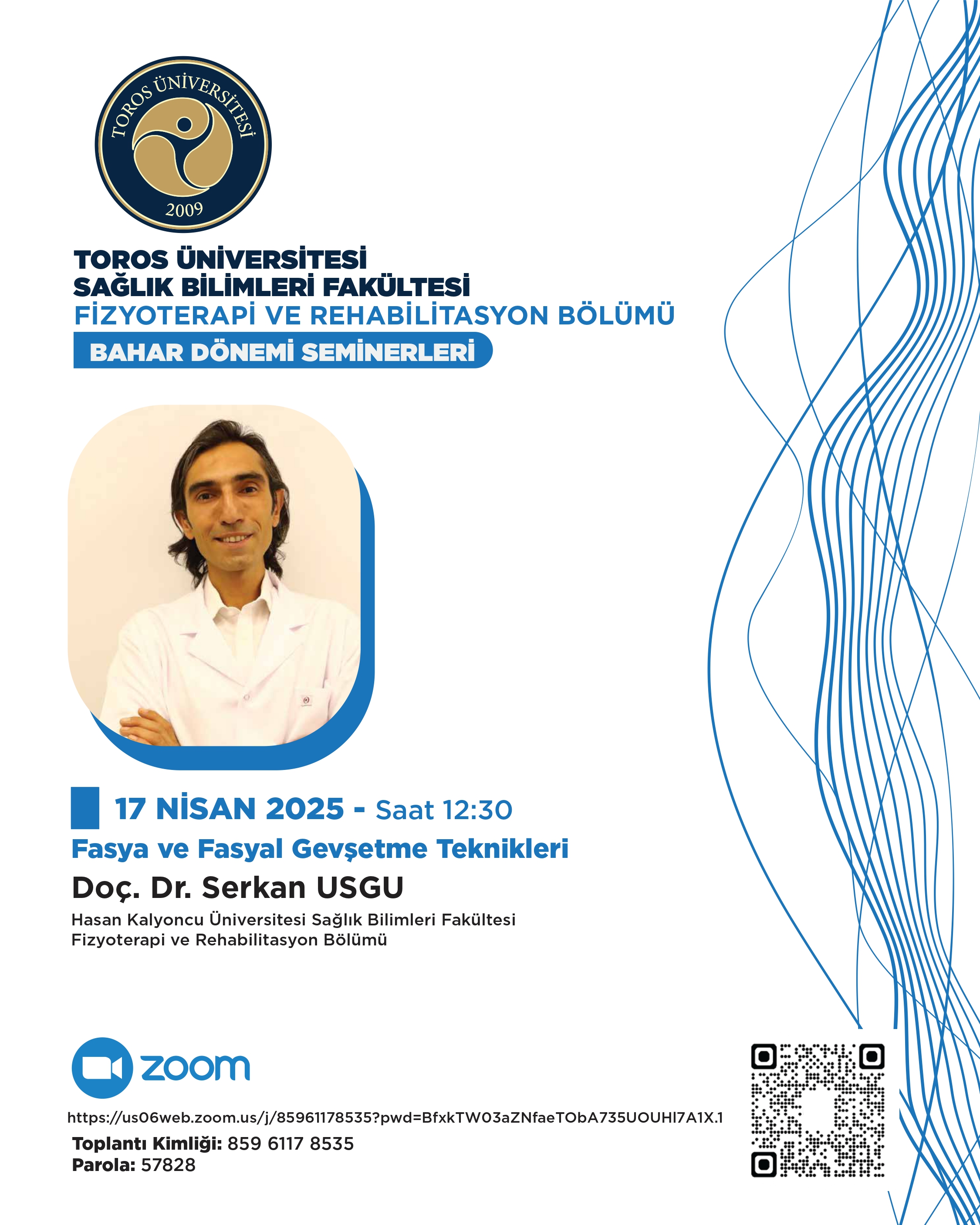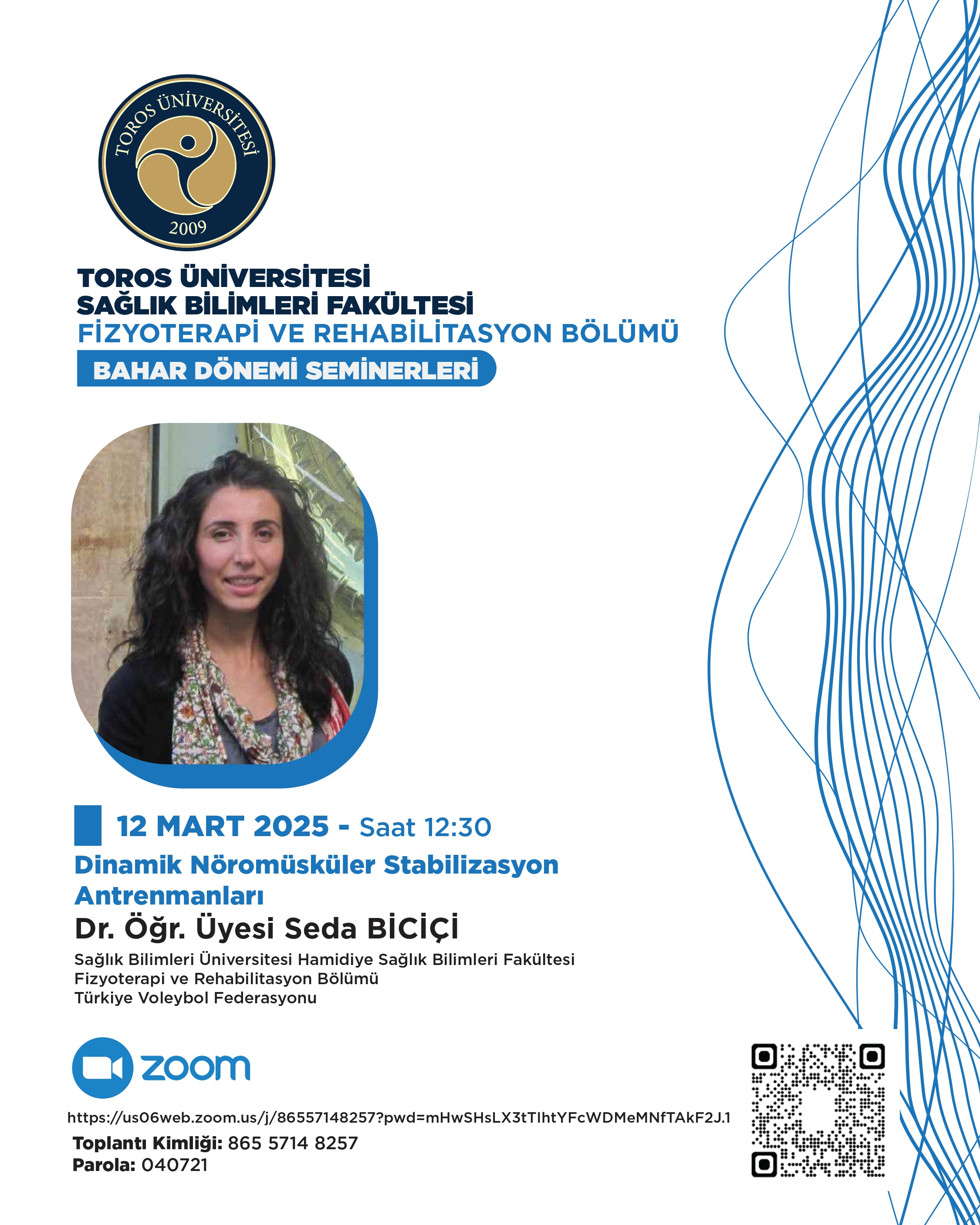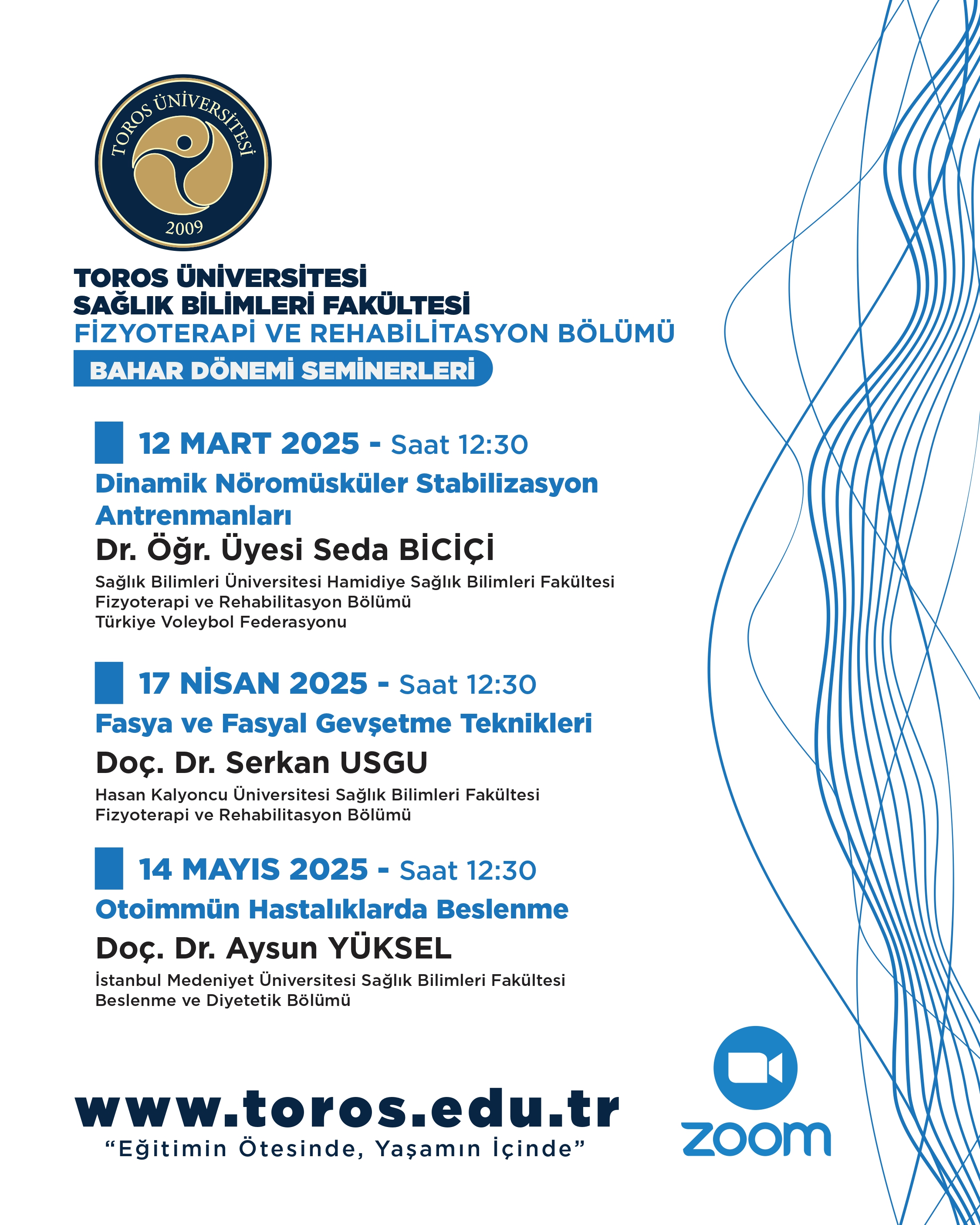 Sağlık Bilimleri Fakültesi Fizyoterapi ve Rehabilitasyon Bölümü tarafından düzenlenen alanında uzman konuşmacıların katılacağı bahar dönemi boyunca yapılacak seminerlerimiz ile ilgili bilgiler aşağıda verilmiştir.