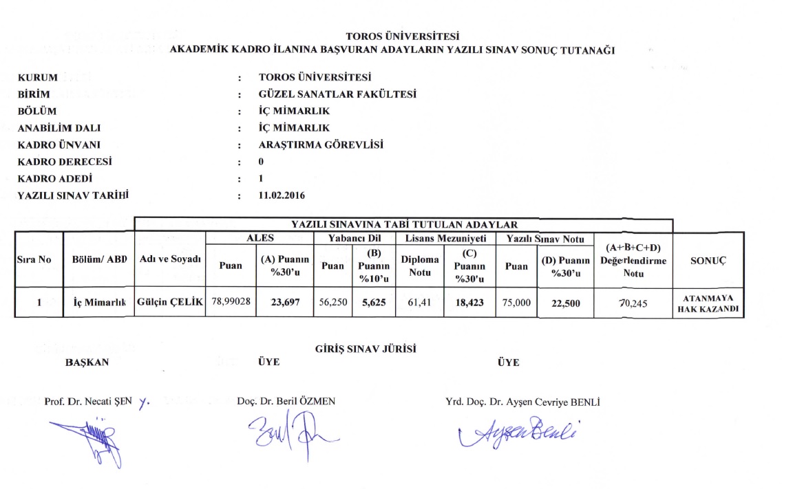 15.02.2016 Güzel Sanatlar Fakültesi Mimarlık Bölümü Öğretim Görevlisi ve İç Mimarlık Bölümü Araştırma Görevlisi Kadro Alım Sonuçları