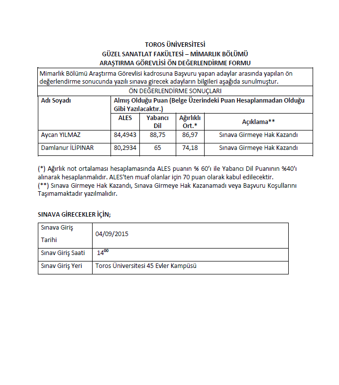 GÜZEL SANATLAT FAKÜLTESİ – MİMARLIK BÖLÜMÜ ARAŞTIRMA GÖREVLİSİ ÖN DEĞERLENDİRME FORMU