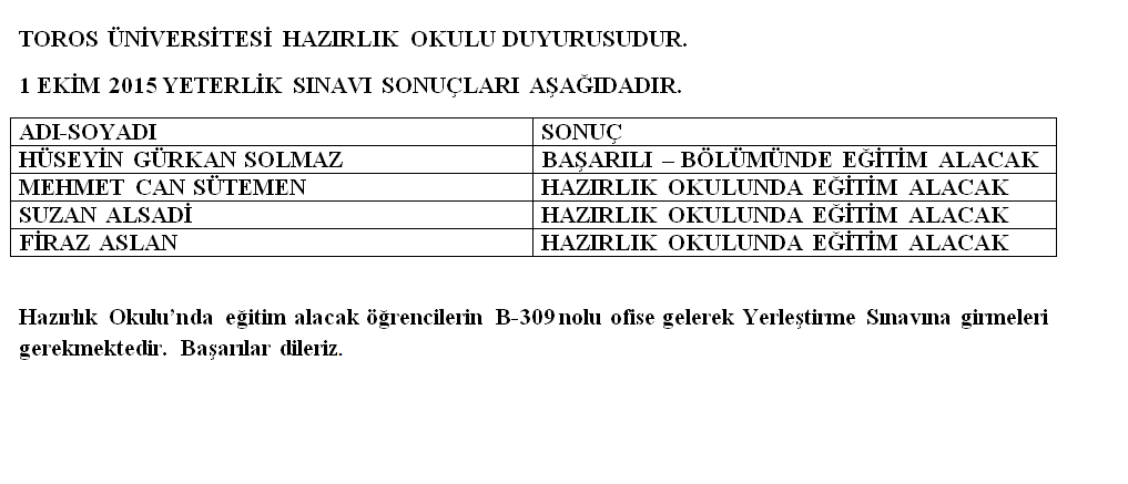HAZIRLIK OKULU 1 EKİM YETERLİK SINAV SONUÇ DUYURUSU