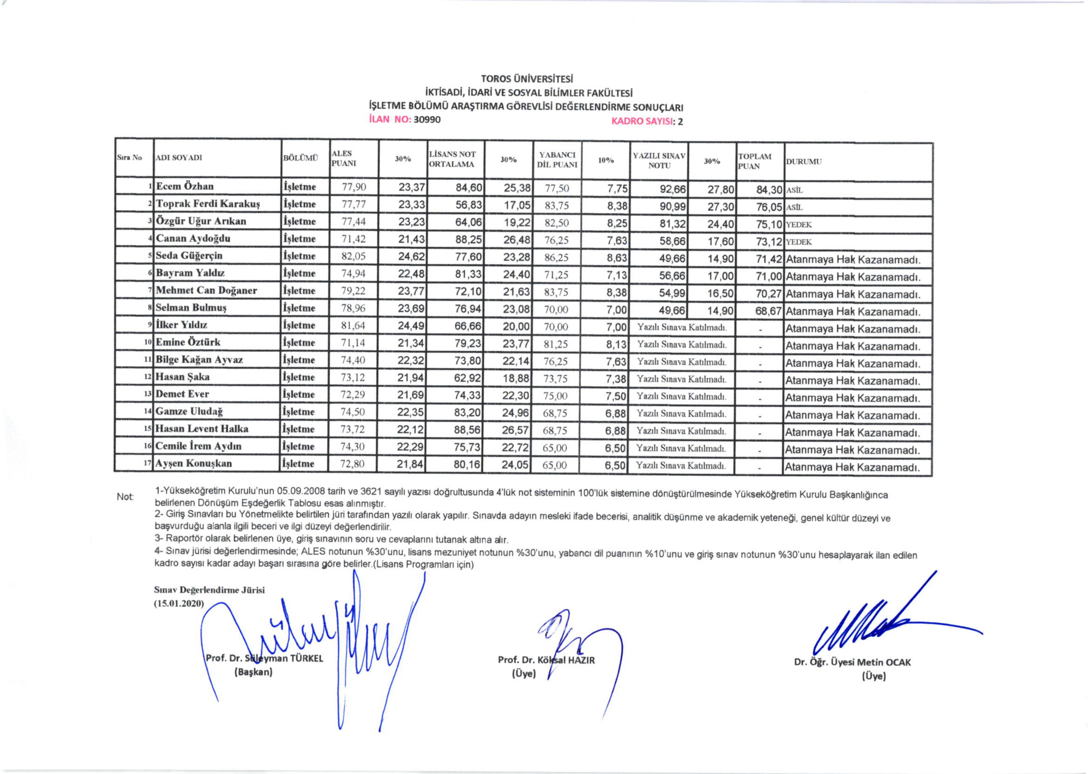 17.01.2020 İKTİSADİ, İDARİ VE SOSYAL BİLİMLER FAKÜLTESİ İŞLETME BÖLÜMÜ ARAŞTIRMA GÖREVLİSİ DEĞERLENDİRME SONUÇLARI (26 ARALIK 2019 TARİHLİ VE 30990 SAYILI RESMİ GAZETEDE YAYINLANAN İLAN)