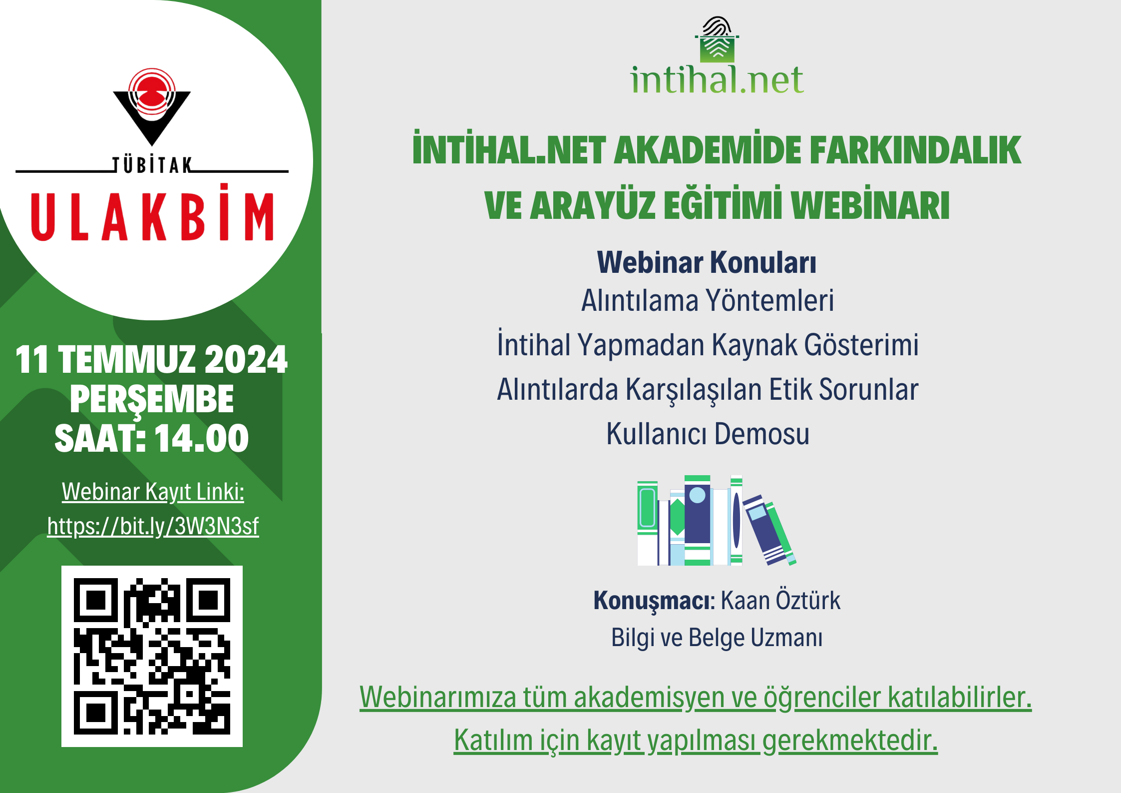 11 Temmuz 2024 Perşembe saat 14.00'da "İntihal.net Akademide Farkındalık ve Arayüz Eğitimi Webinarı" düzenlenecektir. Eğitim ile ilgili duyuru metni ve görsel materyal aşağıda yer almaktadır.