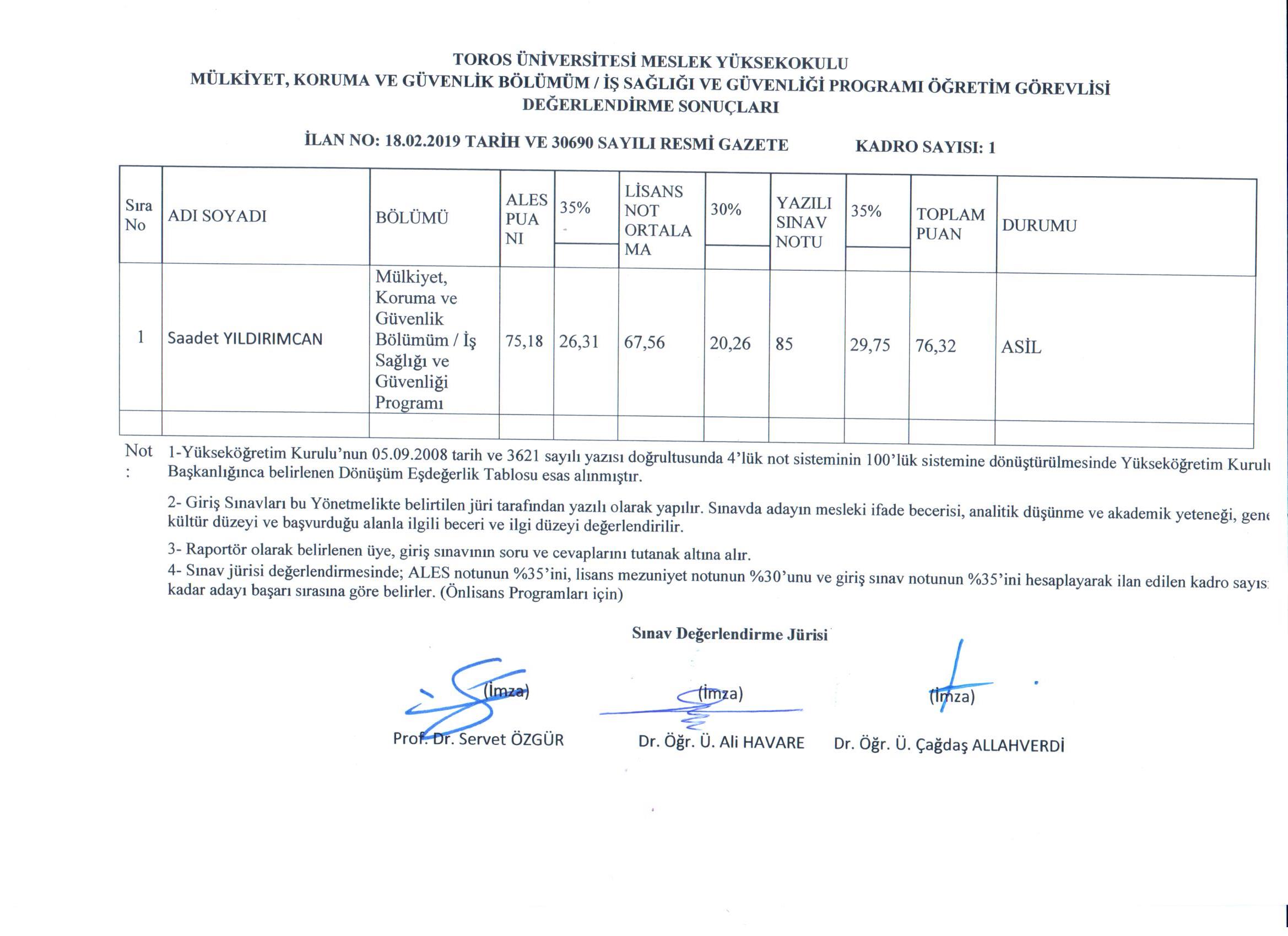 MESLEK YÜKSEKOKULU MÜLKİYET KORUMA ve GÜVENLİK BÖLÜMÜ - İŞ SAĞLIĞI ve GÜVENLİĞİ PROGRAMI DEĞERLENDİRME SONUÇLARI (30690 SAYILI RESMİ GAZETE İLANINA İSTİNADEN)