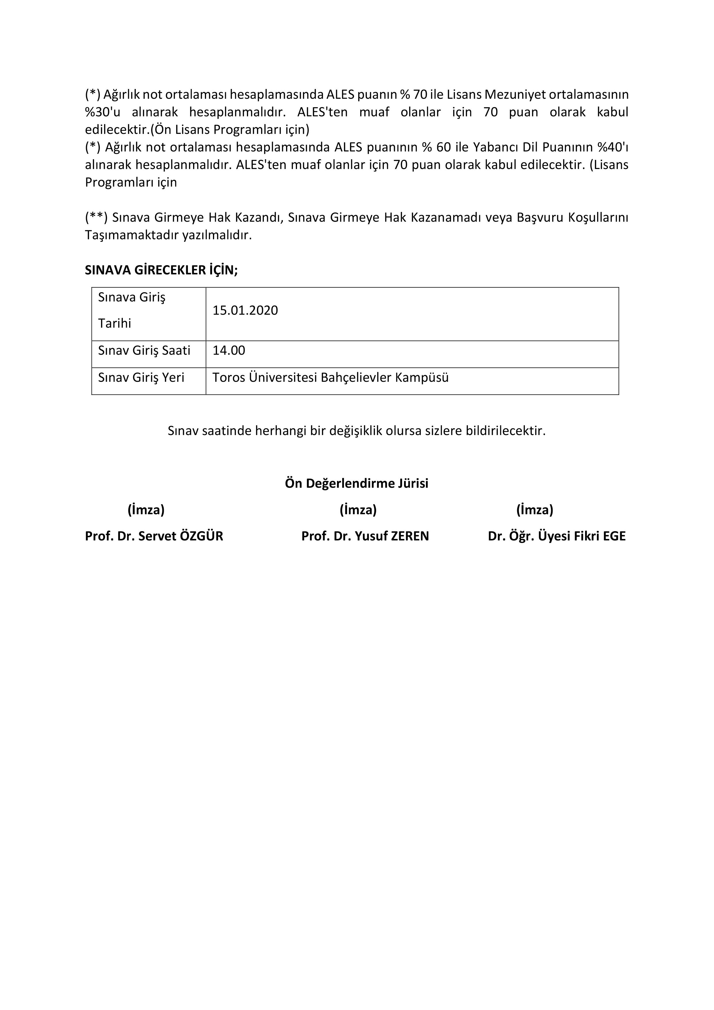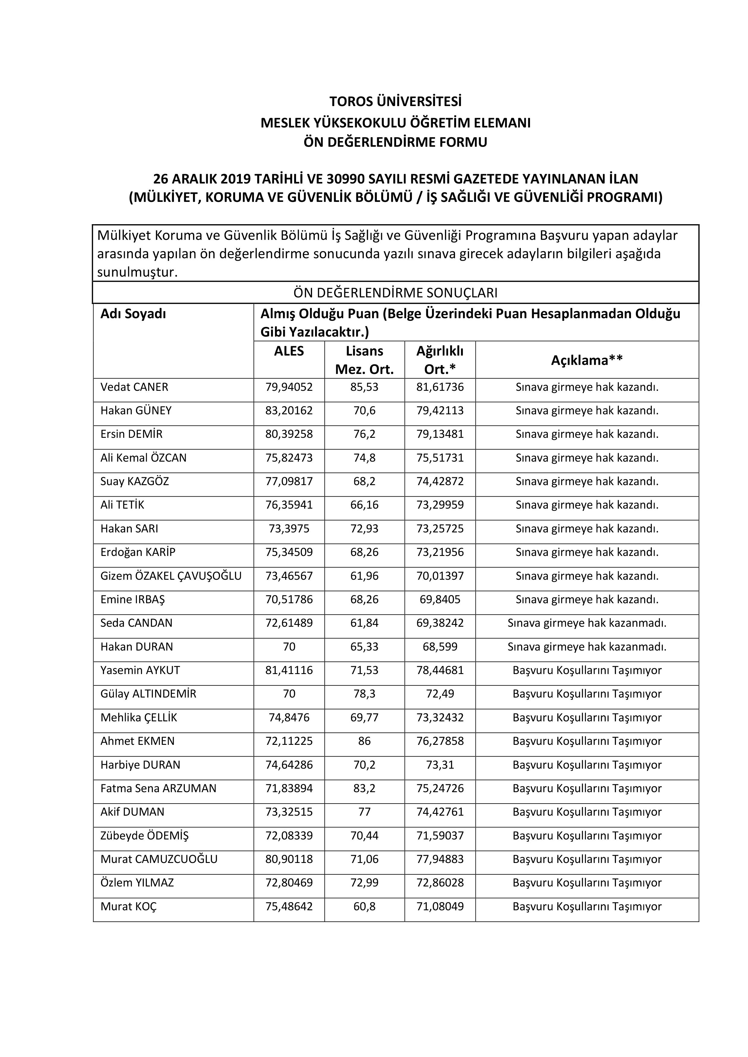 MESLEK YÜKSEKOKULU MÜLKİYETİ KORUMA VE GÜVENLİK BÖLÜMÜ - İŞ SAĞLIĞI VE GÜVENLİĞİ PROGRAMI ÖĞRETİM GÖREVLİSİ ÖN DEĞERLENDİRME SONUÇLARI (26 ARALIK 2019 TARİHLİ VE 30990 SAYILI RESMİ GAZETEDE YAYINLANAN İLAN )
