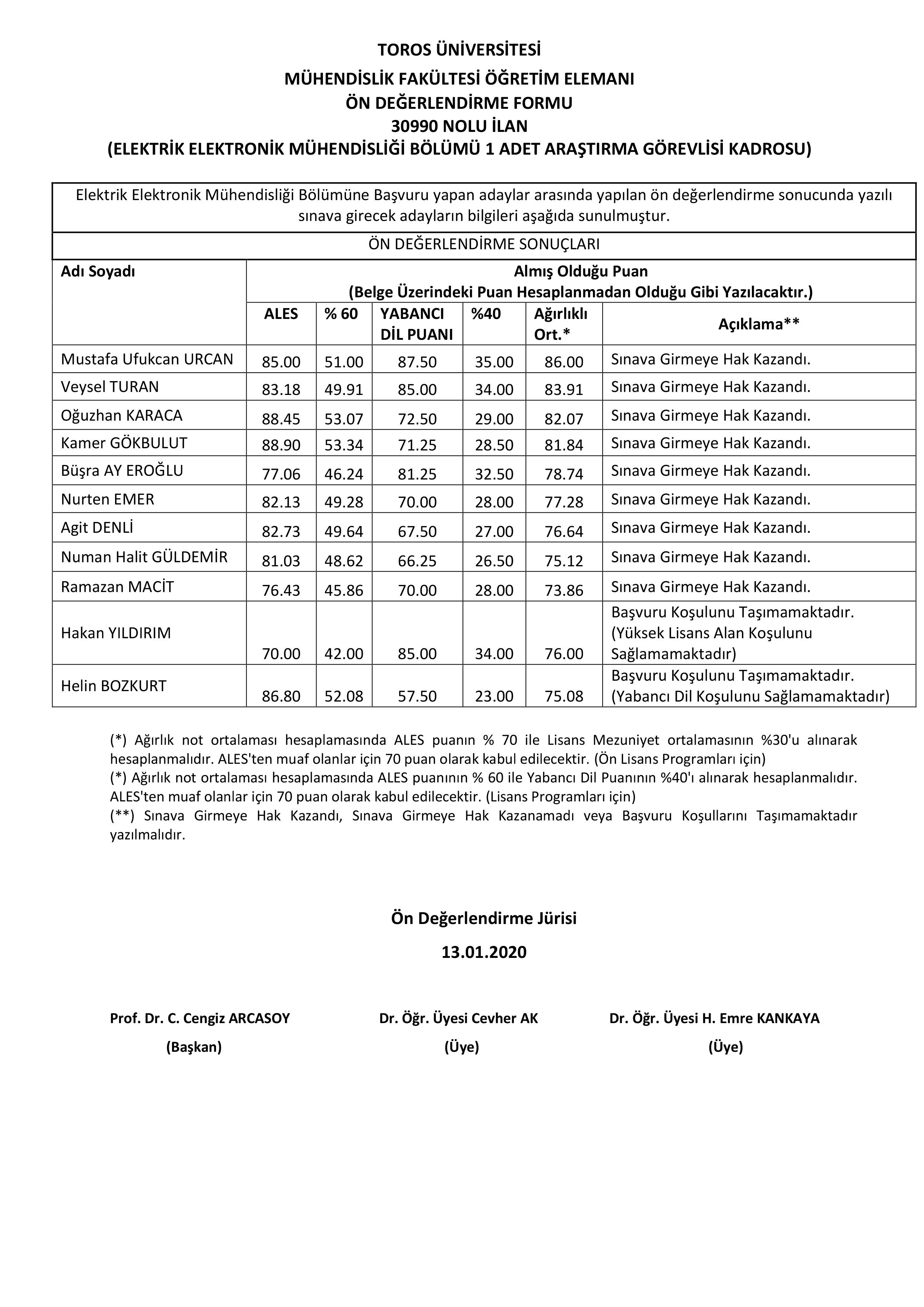 13.01.2020 MÜHENDİSLİK FAKÜLTESİ ELEKTRİK ELEKTRONİK MÜHENDİSLİĞİ BÖLÜMÜ ARAŞTIRMA GÖREVLİSİ ÖN DEĞERLENDİRME SONUÇLARI (26 ARALIK 2019 TARİHLİ VE 30990 SAYILI RESMİ GAZETEDE YAYINLANAN İLAN)