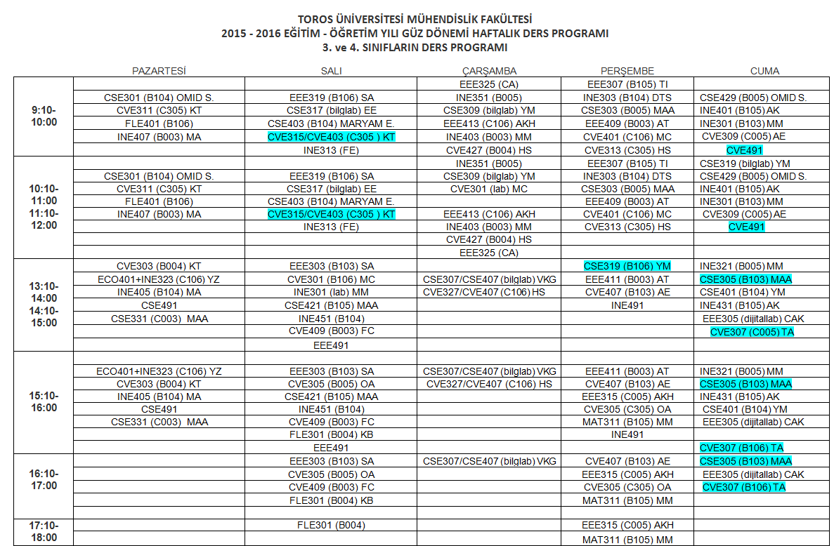 MÜHENDİSLİK FAKÜLTESİ HAFTALIK DERS PROGRAMLARI