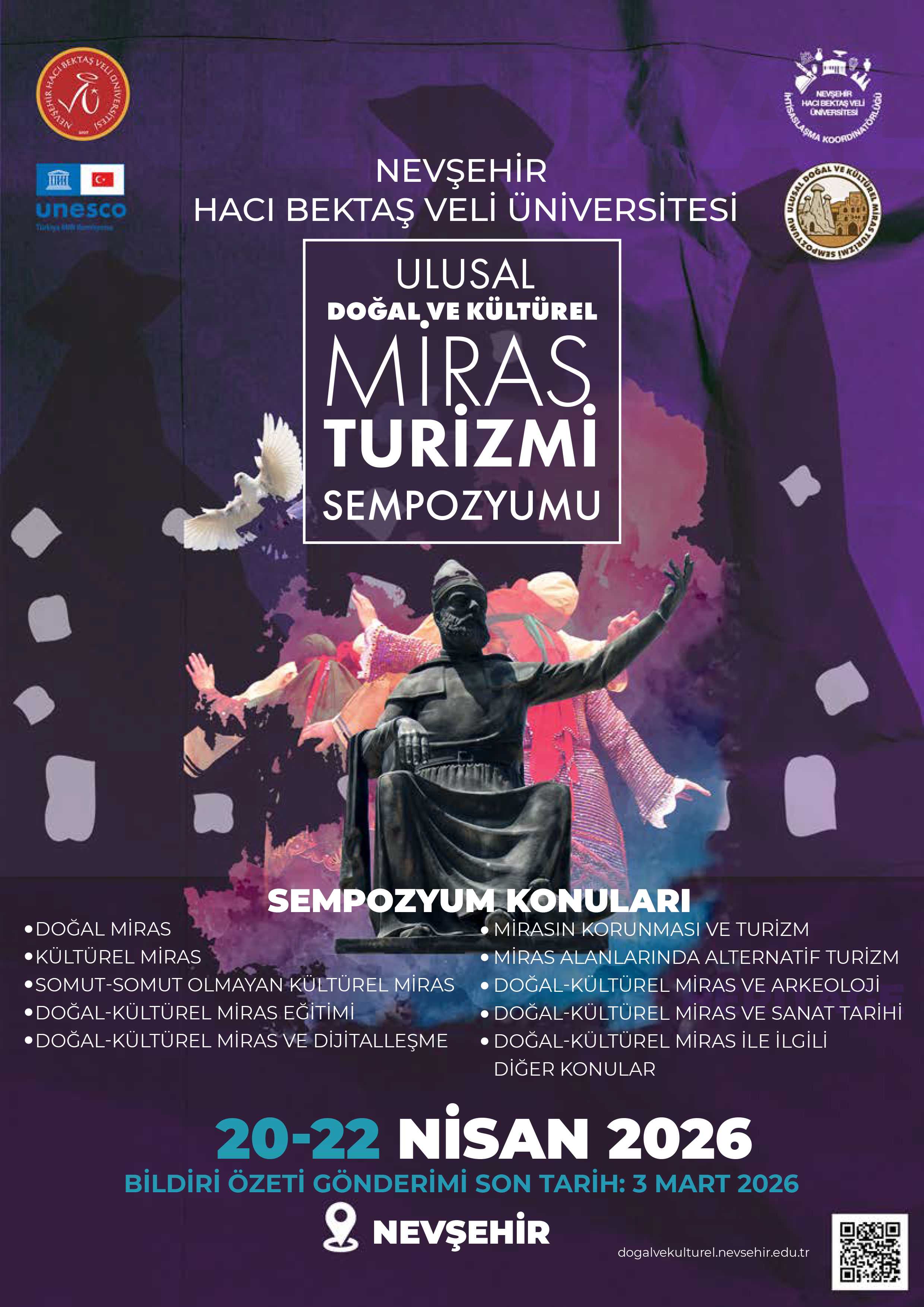 İhtisaslaşma Koordinatörlüğümüz tarafından 20-22 Nisan 2026 tarihleri arasında Nevşehir Hacı Bektaş Veli Üniversitesi ev sahipliğinde düzenlenecek olan "Ulusal Doğal ve Kültürel Miras Turizmi Sempozyumu" düzenlenecektir.