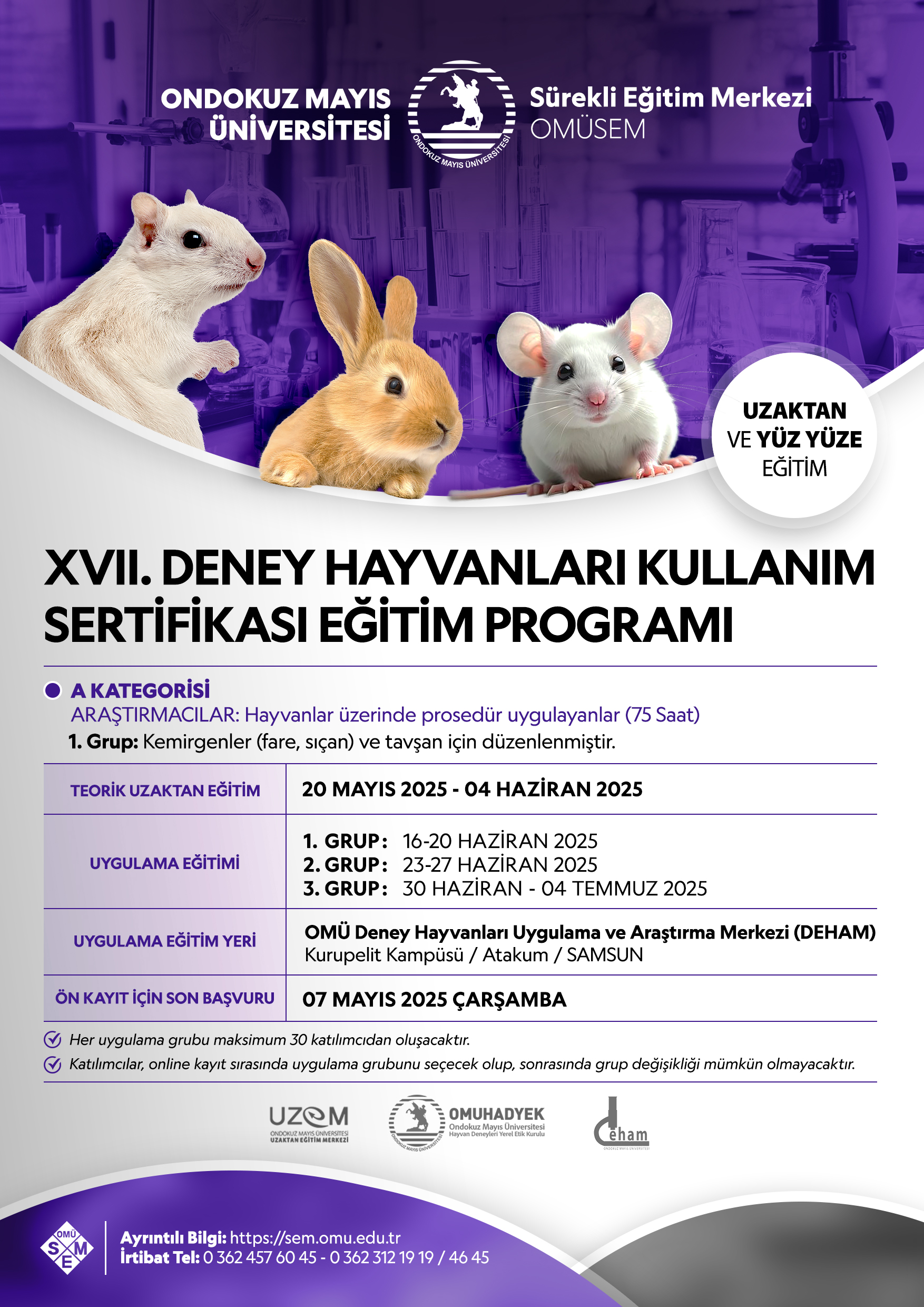 ONDOKUZ MAYIS ÜNİVERSİTESİ REKTÖRLÜĞÜ-Sürekli Eğitim Merkezi Müdürlüğü-Deney Hayvanları Kullanım Sertifikası Eğitim Programı