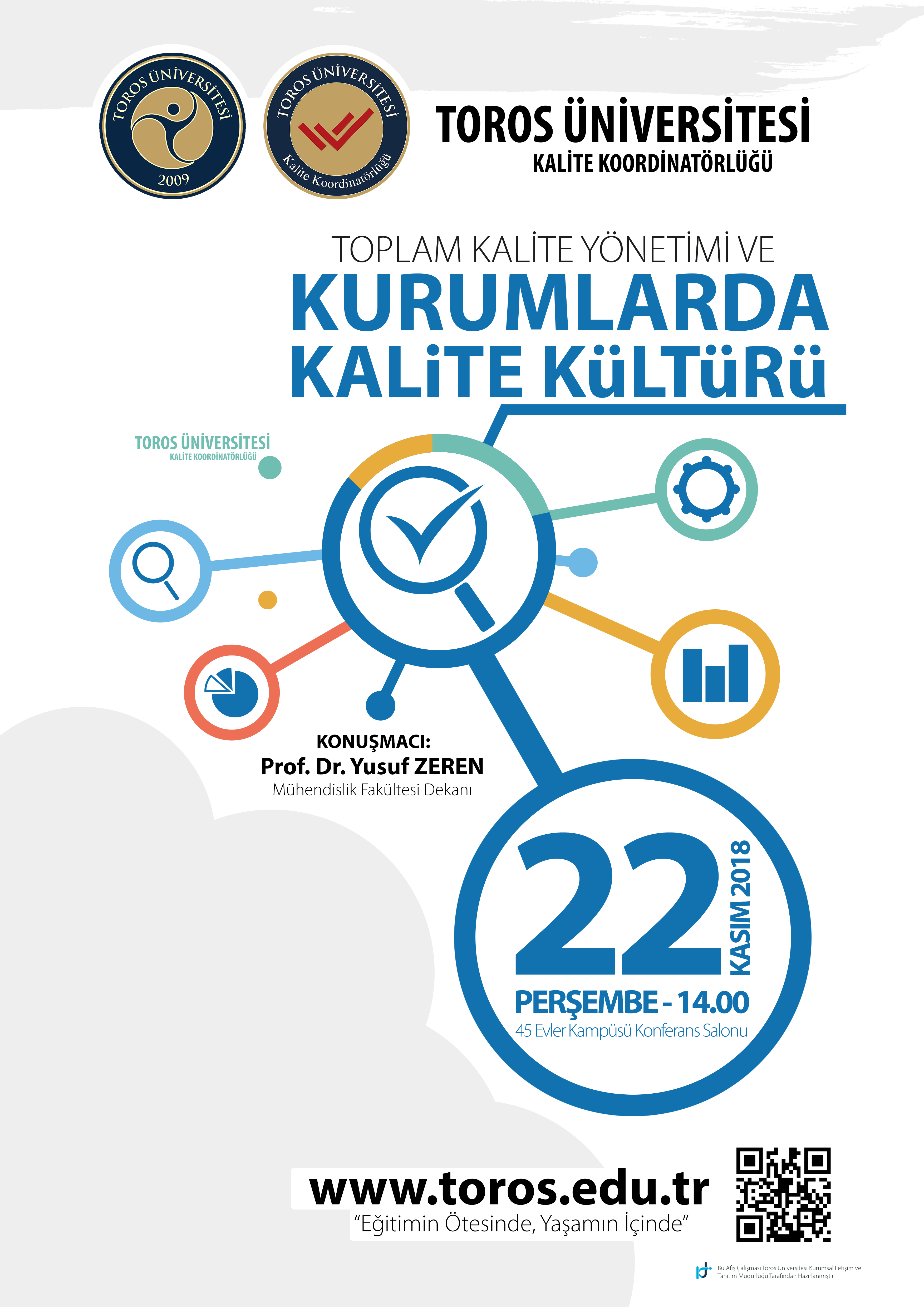 Toros Üniversitesi Kalite Koordinatörlüğü tarafından 22.11.2018 tarihinde "TOPLAM KALİTE YÖNETİMİ VE KURUMLARDA KALİTE KÜLTÜRÜ" konulu konferans gerçekleştirilecektir.