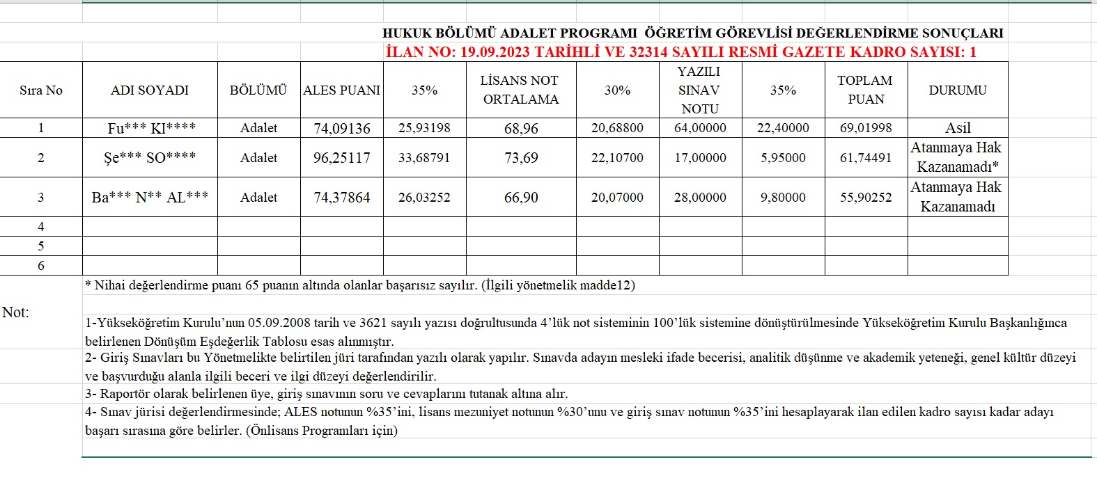 TOROS ÜNİVERSİTESİ MESLEK YÜKSEKOKULU HUKUK BÖLÜMÜ / ADALET PROGRAMI ÖĞRETİM GÖREVLİSİ NİHAİ DEĞERLENDİRME DUYURUSU (19/09/2023 TARİHLİ 32314 SAYILI RESMİ GAZETE İLANI)