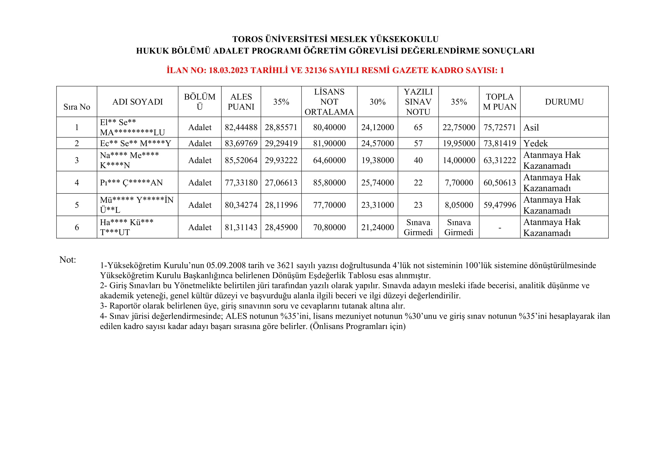 TOROS ÜNİVERSİTESİ MESLEK YÜKSEKOKULU HUKUK BÖLÜMÜ / ADALET PROGRAMI ÖĞRETİM GÖREVLİSİ SONUÇ AÇIKLAMA DUYURUSU (18 MART 2023 TARİHLİ VE 32136 SAYILI RESMİ GAZETE)