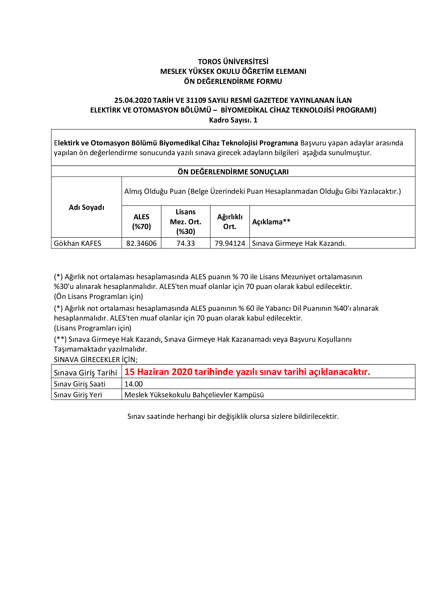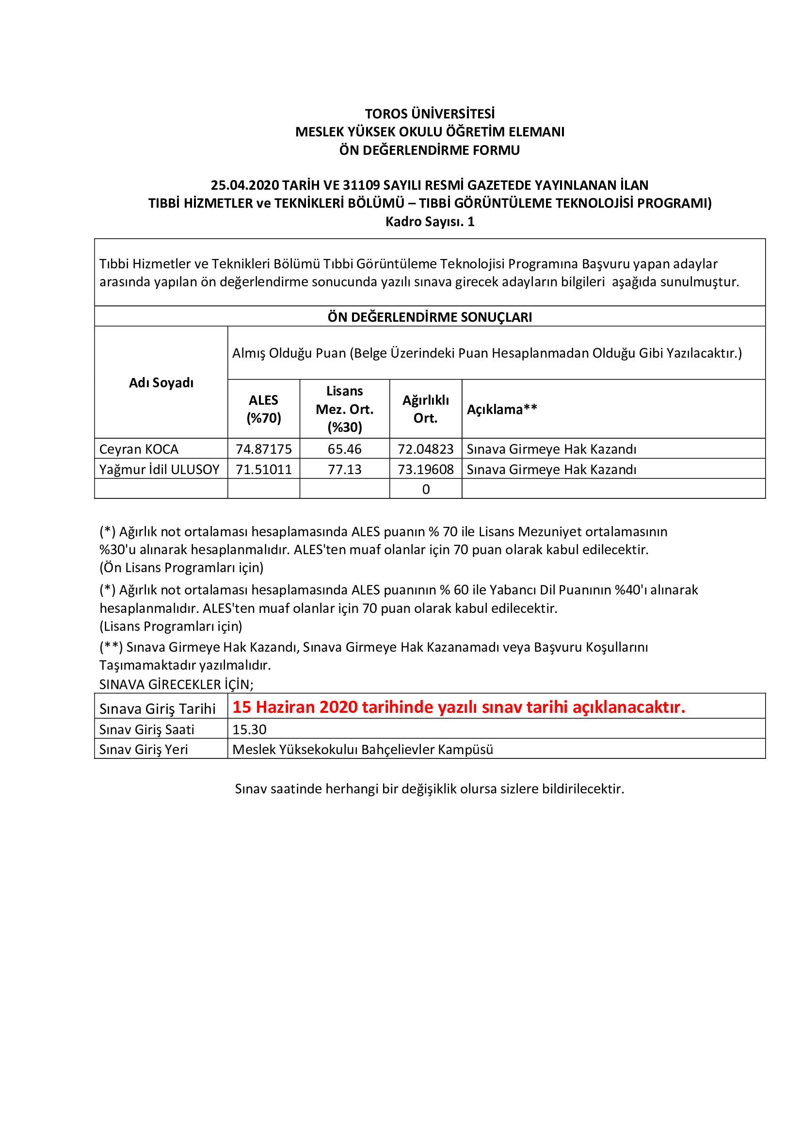 12.05.2020 TOROS ÜNİVERSİTESİ ÖĞRETİM GÖREVLİSİ ÖN DEĞERLENDİRME SONUÇLARI - 25 Nisan 2020 Tarihli ve 31109 Sayılı Resmi Gazete