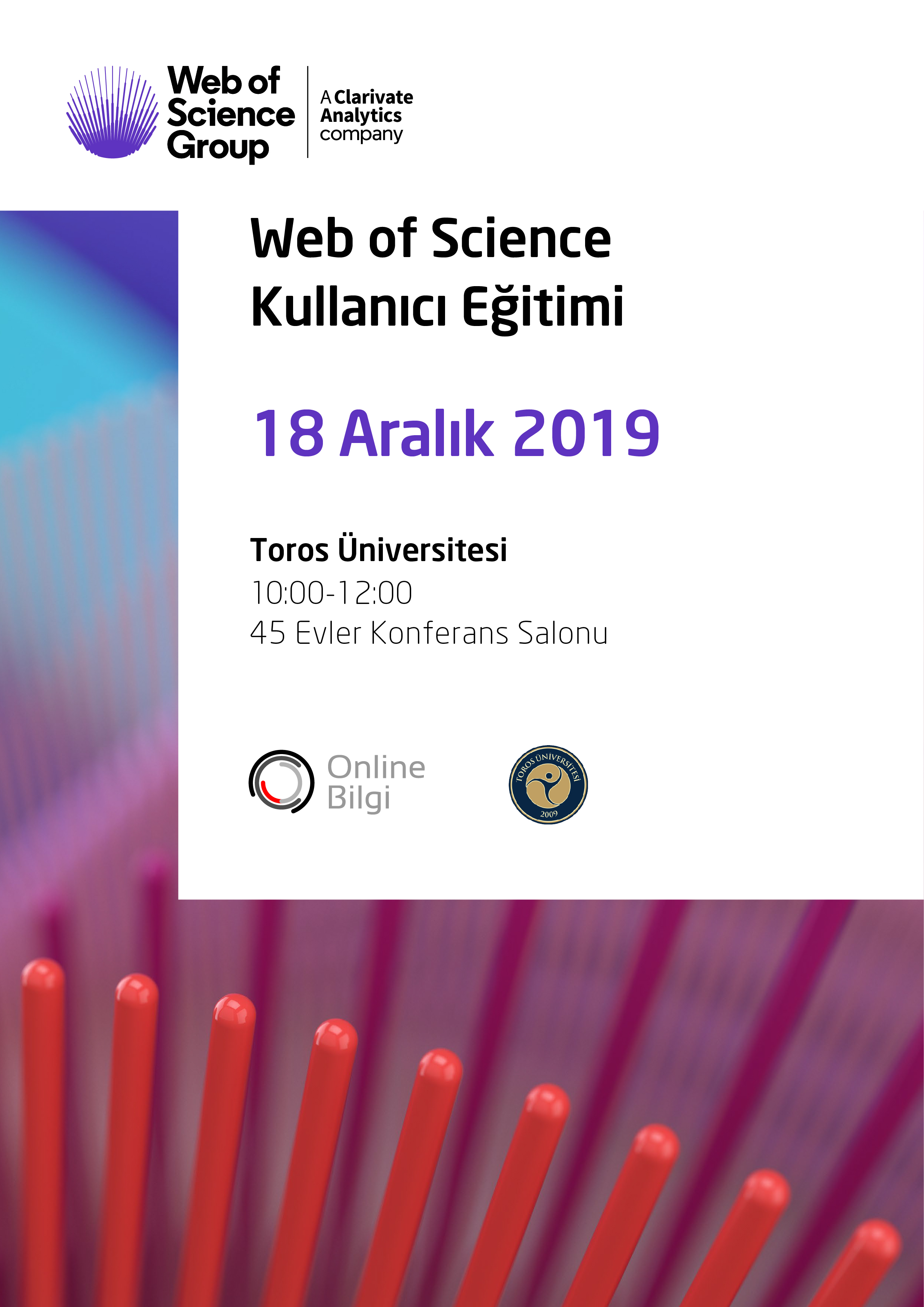 Değerli kullanıcılarımız, Toros Üniversitesi akademik personeli ve öğrencilerine yönelik olarak Kütüphane ve Dokümantasyon Daire Başkanlığı ve Online Bilgi işbirliği ile "Web of Science Kullanıcı Eğitimi" düzenlecektir.