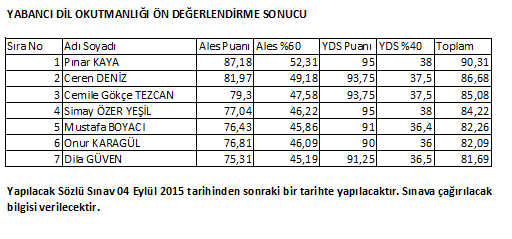 YABANCI DİL OKUTMANLIĞI ÖN DEĞERLENDİRME SONUCU