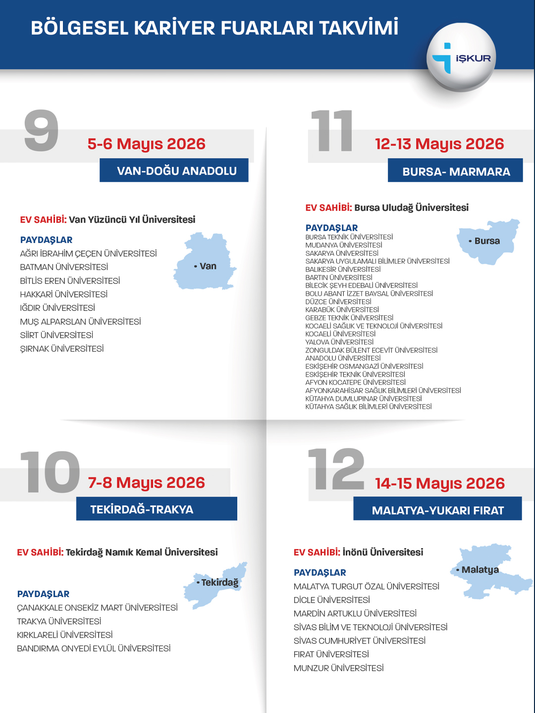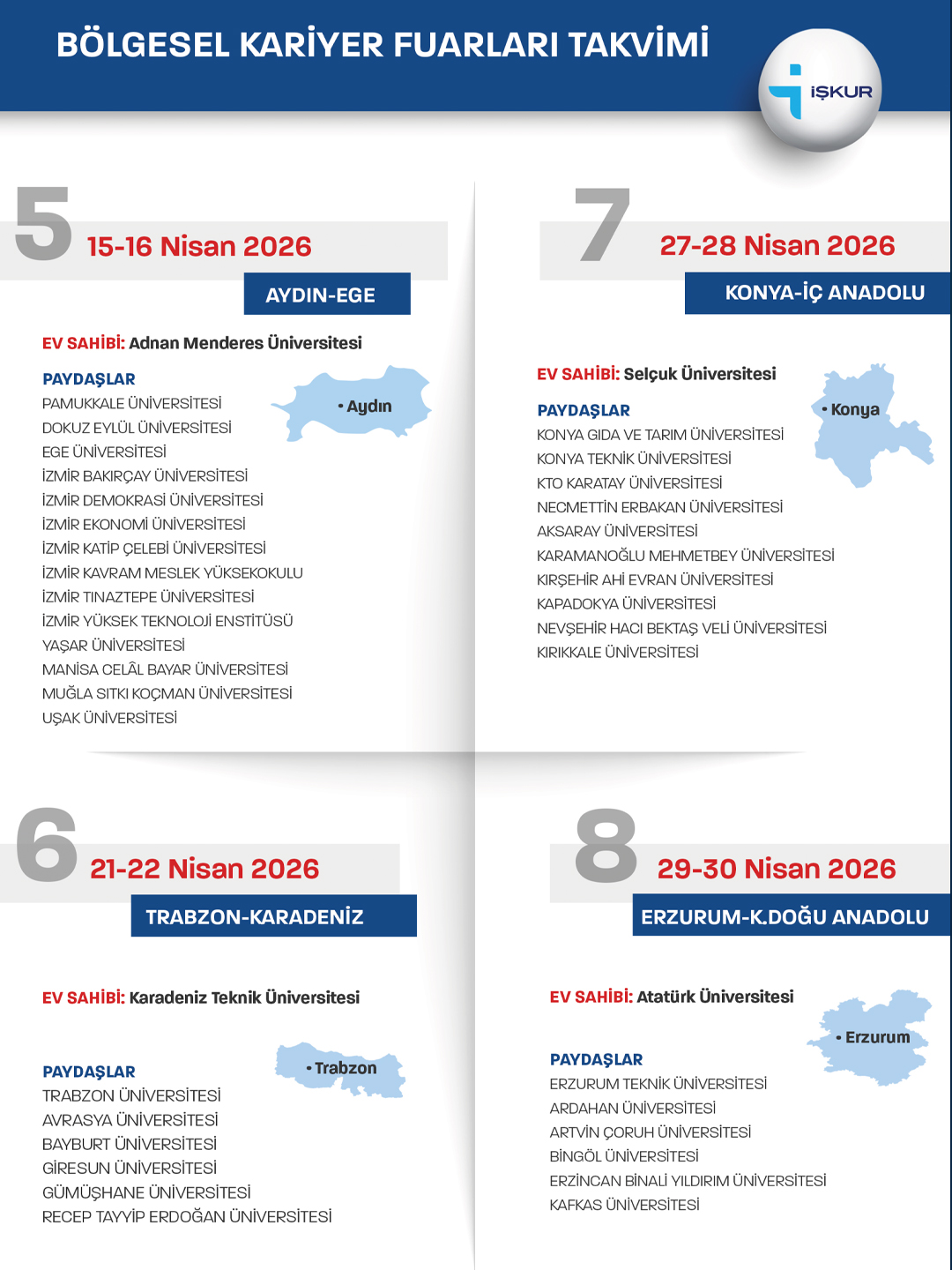 Bu kapsamda, 2026 yılı Bölgesel Kariyer Fuarları; Çalışma ve Sosyal Güvenlik Bakanlığı Türkiye İş Kurumu Genel Müdürlüğü koordinasyonunda, ekte yer alan fuar takvimi doğrultusunda üniversitelerin ev sahipliğinde gerçekleştirilecektir.
