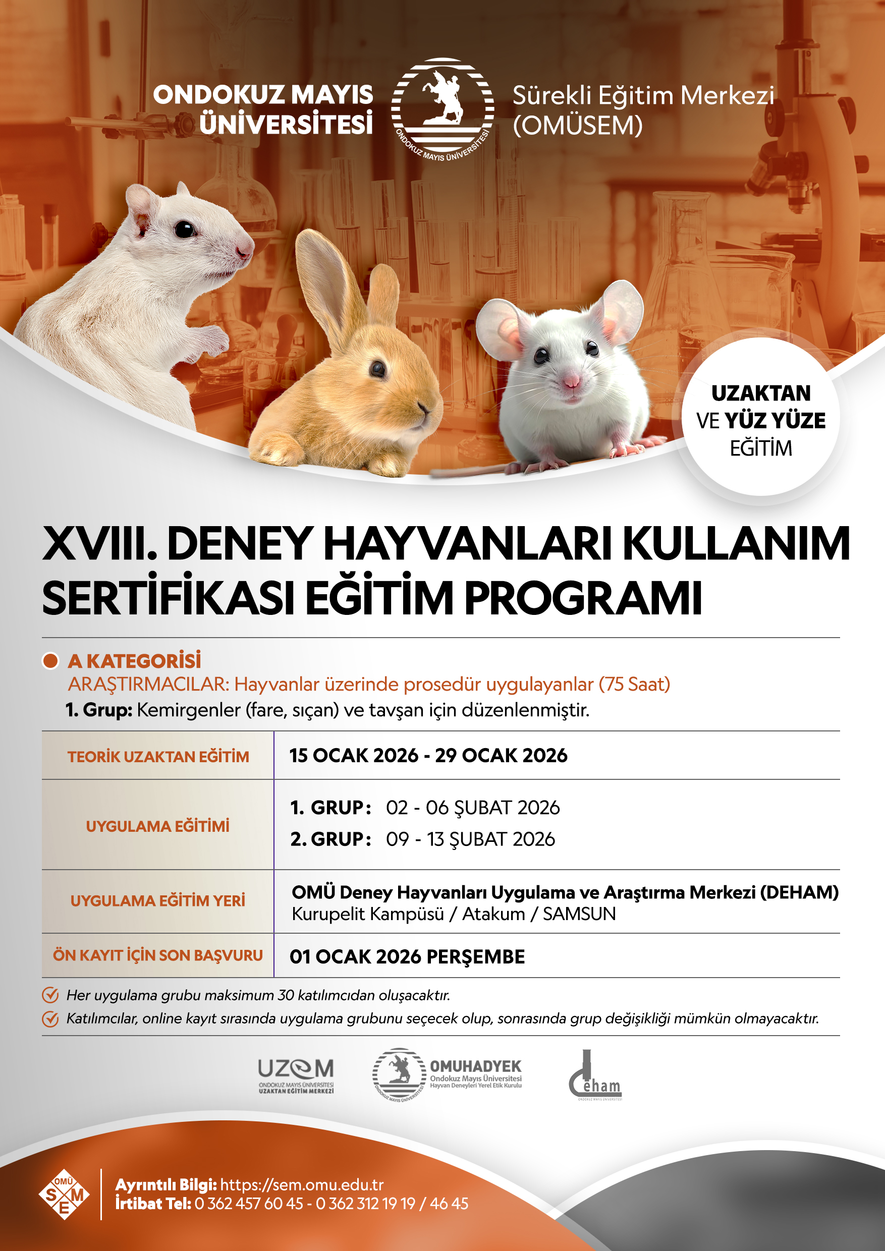 Ondokuz Mayıs Üniversitesi Hayvan Deneyleri Yerel Etik Kurulu (HADYEK) tarafından düzenlenen ve Sürekli Eğitim Merkezince (OMÜSEM) organize edilen “XVIII. Deney Hayvanları Kullanım Sertifikası Eğitim Programı”na online kayıt formu “sem.omu.edu.tr” adresinde yer almaktadır.