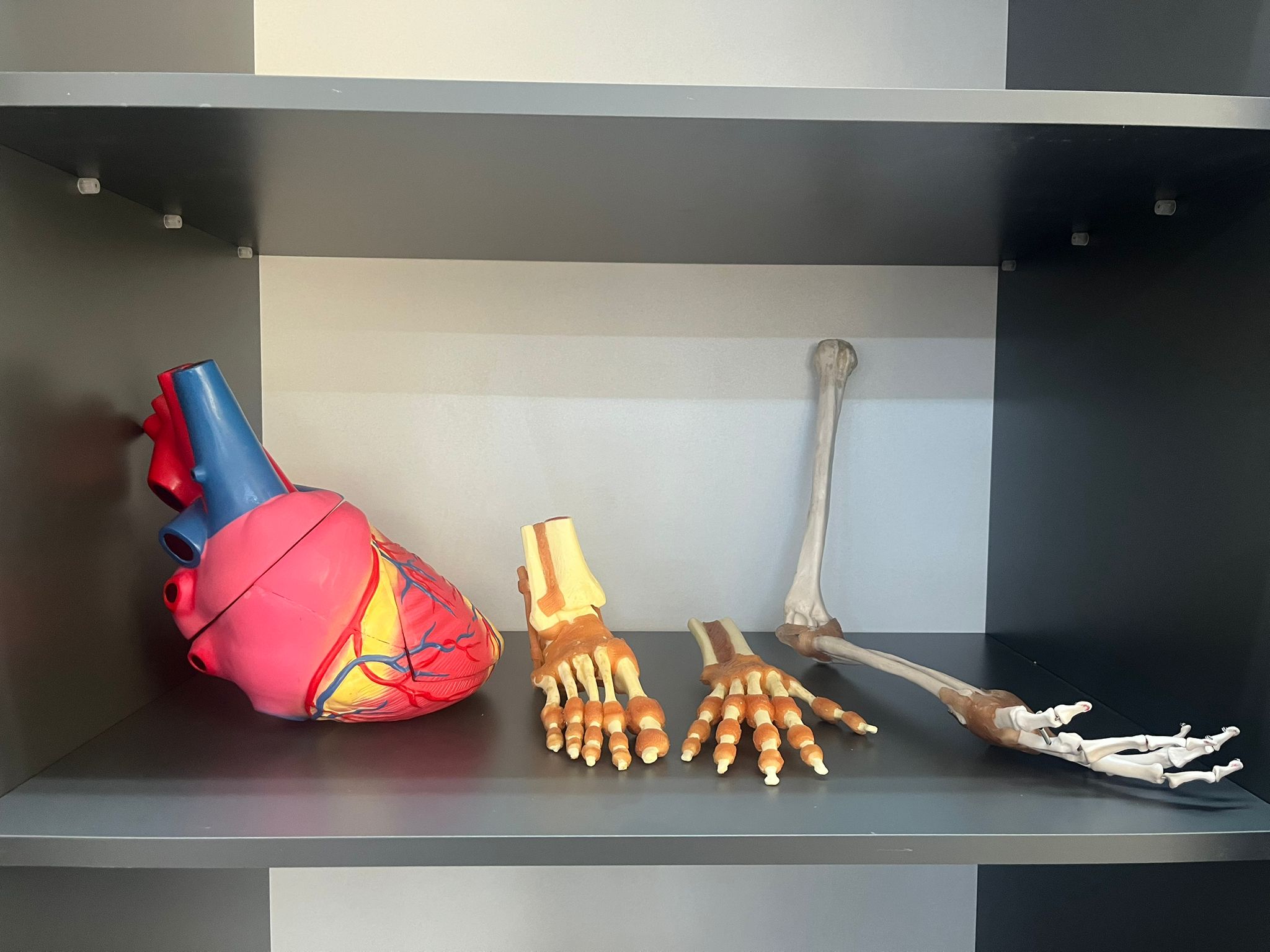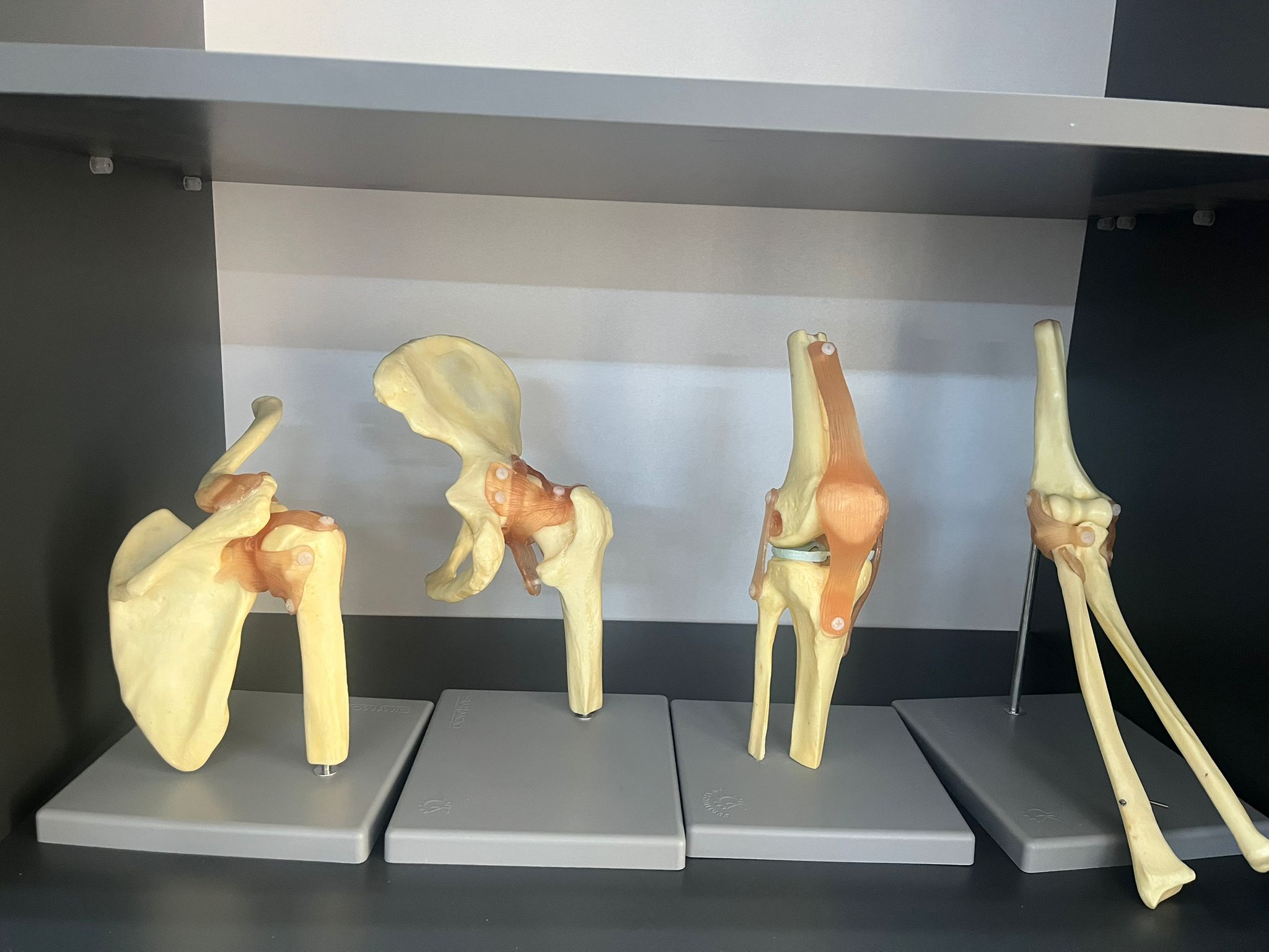 Laboratuvar bünyesinde yer alan iki adet iskelet maketi, öğrencilerin insan iskelet sistemini bütüncül olarak incelemelerine olanak tanımaktadır. Bunun yanı sıra, kemiklere ve eklemlere ait ayrıntılı bireysel modeller sayesinde öğrenciler; kemiklerin anatomik yapılarını, eklem yüzeylerini, bağlantı özelliklerini ve hareket mekanizmalarını daha detaylı biçimde değerlendirebilmektedir. Bu materyaller, özellikle kas-iskelet sistemi, kinezyoloji, biyomekani ve ortopedik rehabilitasyonla ilişkili derslerde öğrenmenin kalıcılığını artırmaktadır.
