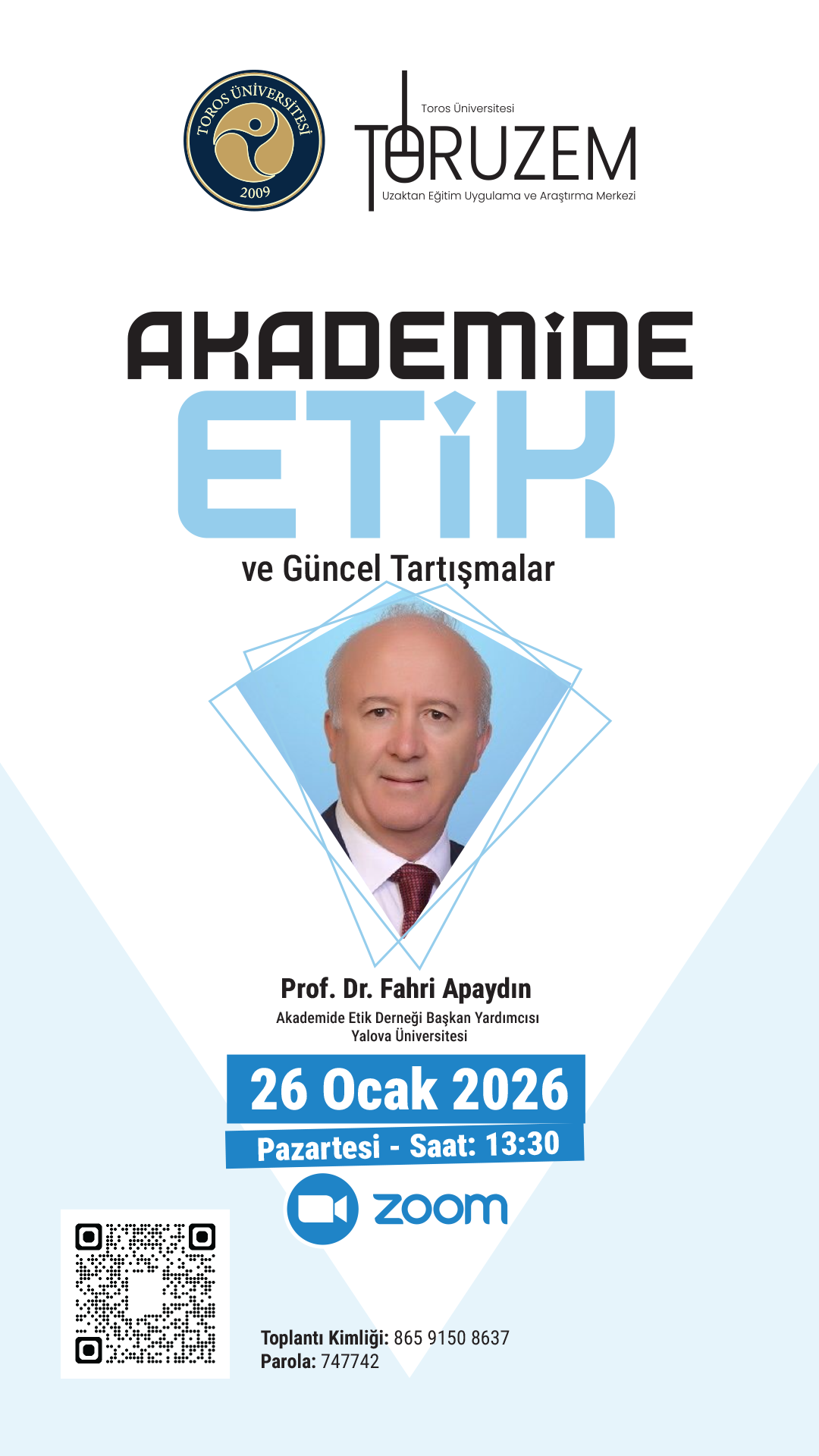 10. TORUZEM ile Öğrenme ve Öğretme Koordinatörlüğünün koordinesinde tüm akademik personelimize ve lisansüstü öğrencilerimize yönelik olarak planlanan “Akademide Etik ve Güncel Tartışmalar” konulu eğitim sunumu Yalova Üniversitesinden Akademide Etik Derneği Başkan Yardımcısı Prof.Dr. Fahri APAYDIN tarafından 26 Ocak 2026 Pazartesi günü saat 13:30'da çevrimiçi olarak verilmiştir.