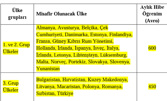 Erasmus+ programında hibeler ülkelerin yaşam maliyetlerine göre gruplandırılmaktadır.