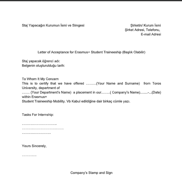 NOT: Gideceğiniz kurumun kabul mektubu formatına göre değişiklik gösterebilmektedir. Bu evrak sadece örnek olarak koyulmuştur.